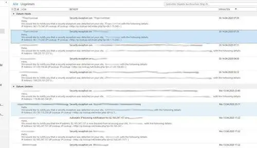 Es ist erschreckend als Serveradministrator zu sehen, mit welcher Macht die Hackversuche und Angriffe auf Websites seit Beginn der Krise rapide zugenommen haben. Das beigefügte Bild zeigt meinen Admin-Posteingang von Montag 17:22 bis heute 7:35 Uhr und 10 abgewehrte schwere Angriffe.